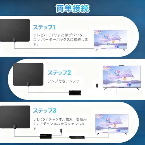 この室内アンテナは、独自開発のスマートブースト技術を採用し、内蔵された高性能ブースターによって受信信号を約3倍に増幅します。