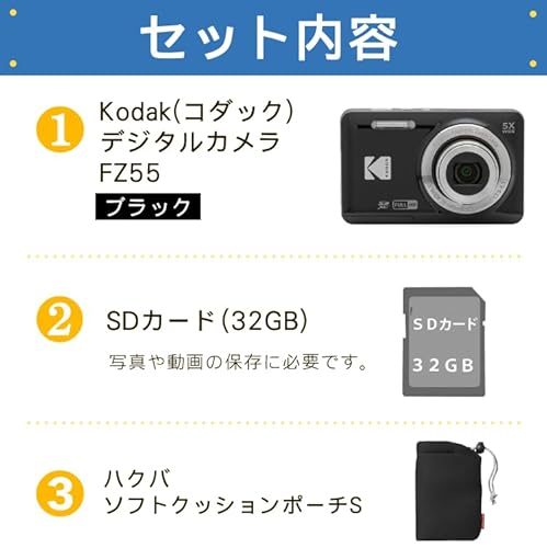 コダックのコンパクトデジタルカメラFZ55は、充電式かつSDカード32GB、専用ポーチがセットになっており、購入してすぐに撮影を楽しめる点が魅力です。